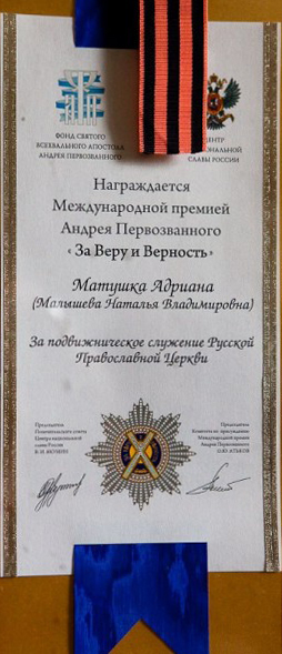 В 2000 году тетя приняла монашеский постриг с именем Адриана. В декабре 2009 года она стала лауреатом Международной премии «За Веру и Верность», учрежденной фондом Андрея Первозванного.