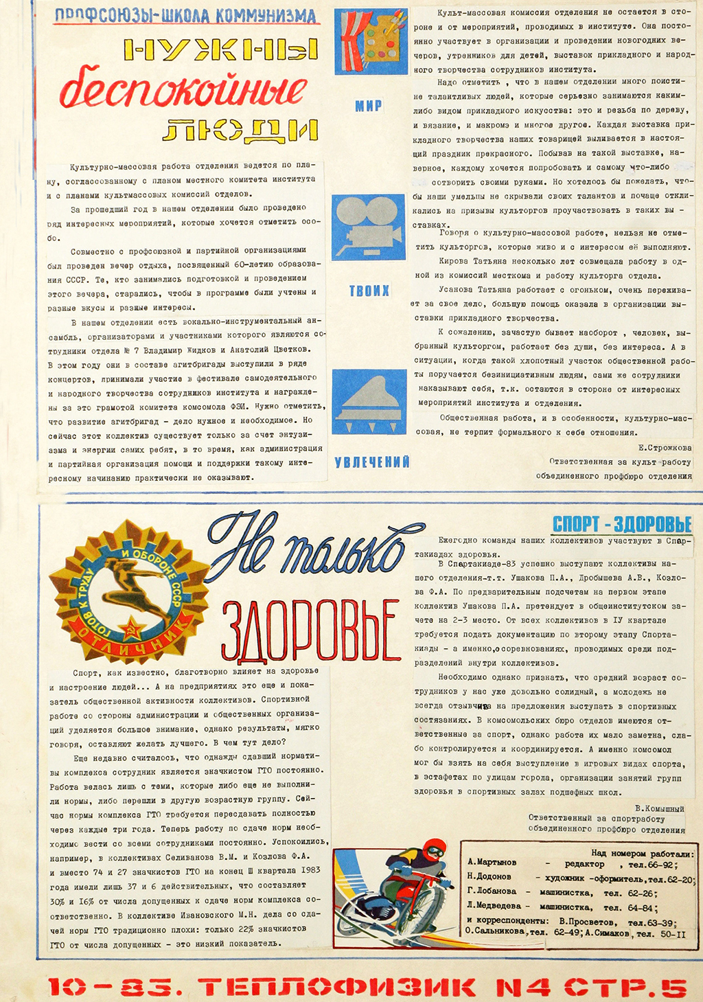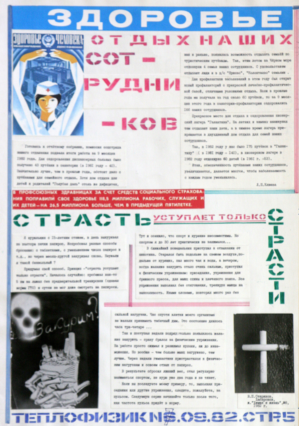 Информация о спорте и здоровье присутствует практически в каждом номере. Из номеров газет можно узнать, какими видами спорта занимались сотрудники. Видим, что кроме традиционных лыжных, футбольных, шахматных турниров и соревнований, проводились еще и спартакиады, сдавались нормы ГТО. Страничка здоровья – тоже часто встречается в выпусках. Так, в январском номере 1983 года терапевт (цеховый) напоминает о необходимости выполнения санитарно-технических мероприятий (утепление окон, хранение спецодежды, оборудование рабочих мест). В выпуске №7 за 1982 год выделен целый лист под страничку здоровья, содержащую ряд статей о вреде курения, информацию соцстраха об отдыхе сотрудников.