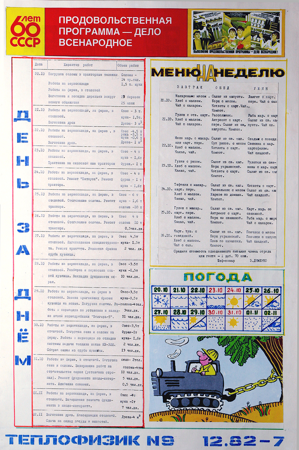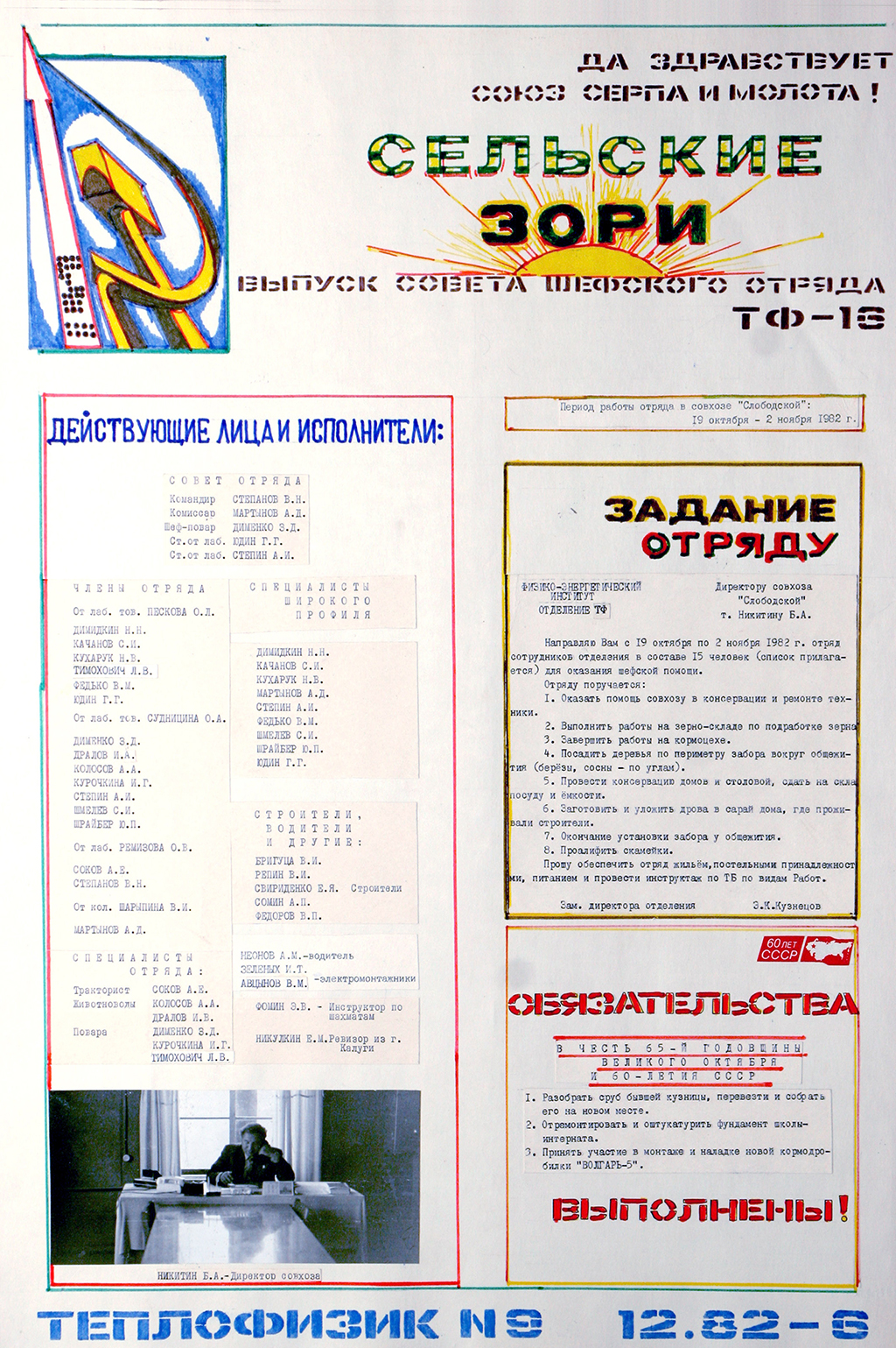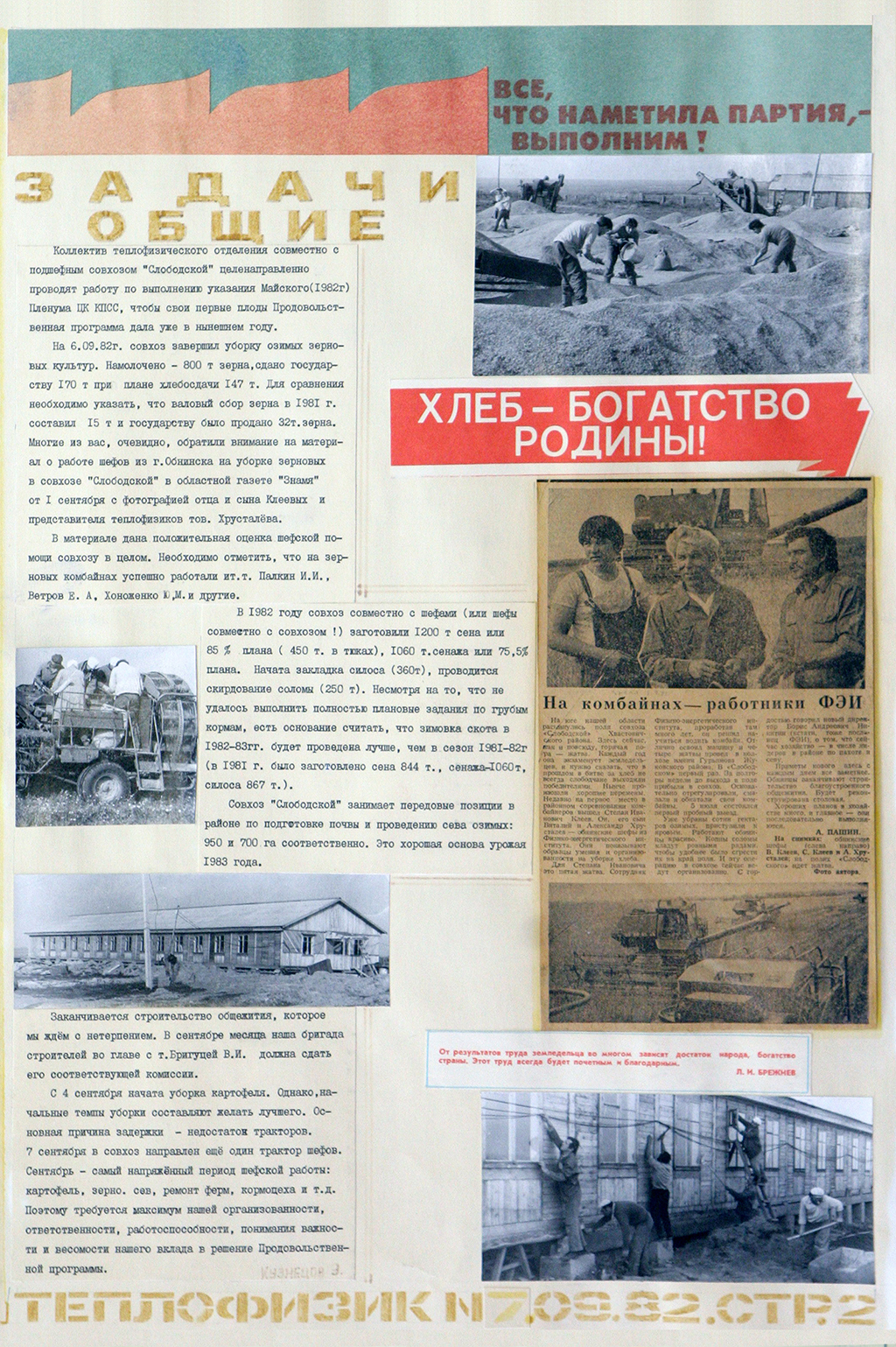 Большое внимание уделялось социалистическому соревнованию и шефской работе на селе. Действительно, в то время помощь города селу была существенна. Это сегодня прилавки магазинов завалены импортными сельхозпродуктами, а поддержка отечественного сельского хозяйства может выливаться в субсидирование банков. В советское же время сельское хозяйство поддерживалось непосредственно трудом работников промышленных, научных, образовательных организаций, т.е. поддержка была по сути всенародная. Сотрудники ФЭИ заготавливали корма для скота, убирали урожай картофеля и других овощей, строили дома, реконструировали кормоцех, короче, что только не делали наши сотрудники в подшефных колхозах. И конечно, достижения и проблемы шефской работы находили свое отражение в стенной печати. В газете можно найти статьи под заголовками: «Вести с полей», «Союз серпа и молота», «Вести из Слободского», «В совхозе Березовский», «Эффективно используем сельхозтехнику», «Нужна малая механизация», «Механизаторы в Слободском» и т.д. Даже специальный выпуск «Сельские зори» был подготовлен.