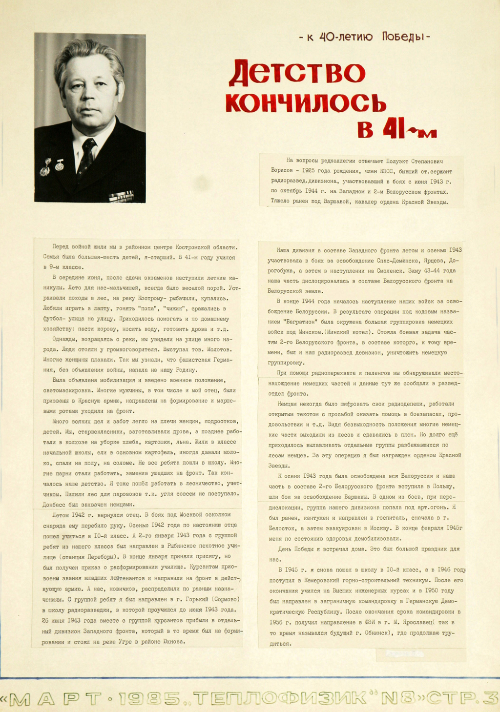 Не забывали в газете рассказывать о ветеранах Великой Отечественной Войны, особенно в преддверии Дня Победы и в декабрьских номерах, приуроченных к датам победы под Москвой (1981 год – 40 лет победы под Москвой), например, «Путь фронтовика», «Танки пройдут», «Путь к Берлину», «Штурм фашистского логова». В ноябрьских номерах хотя бы одна статья была посвящена годовщине Великой Октябрьской социалистической революции.