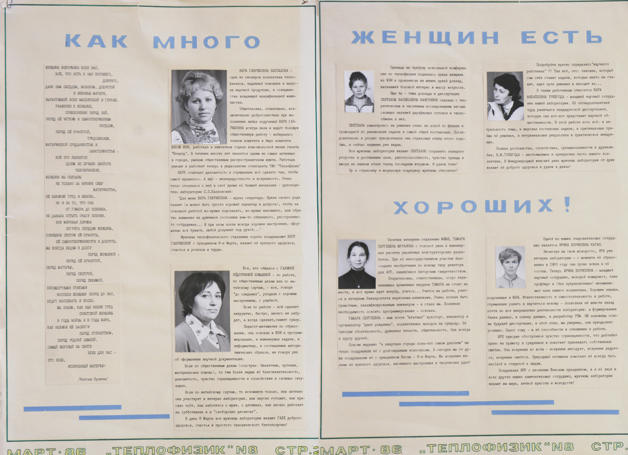 Мартовские номера обычно содержали поздравления и статьи о коллегах – работающих рядом женщинах. Статьи написаны с теплотой, в них отмечаются не только производственные заслуги, но и душевные качества женщин-теплофизиков. Перечислим несколько заголовков: «Хороший человек», «Наша Аннушка», «Душа коллектива», «За ней не угнаться», «Мама-теплофизик», «Незаменимые».