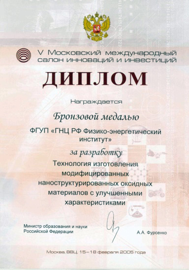 - Диплом V Международного салона инноваций и инвестиций за разработку технологии изготовления модифицированных наноструктурных оксидных материалов с улучшенными характеристиками.
