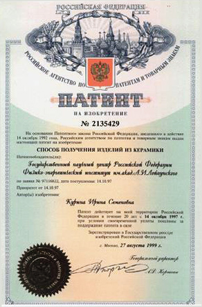 - Патент РФ №2135429 (1999) «Способ получения изделий из керамики».