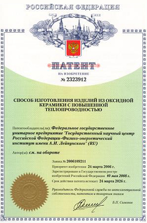 - Патент РФ №2323912 (2008) «Способ изготовления изделий из оксидной керамики с повышенной теплопроводностью».