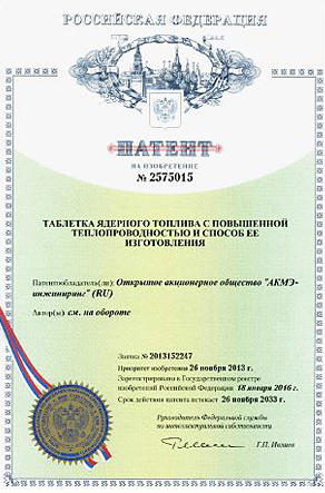 - Патент РФ №2575015 (2016) «Таблетка ядерного топлива с повышенной теплопроводностью и способ её изготовления».