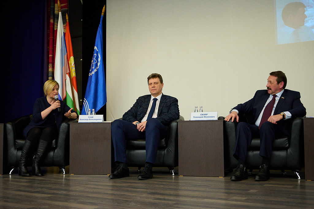 В дискуссии приняли участие председатель правления ассоциации «Калужского фармацевтического кластера» Игорь Пожарнов, ректор Калужского государственного университета им. К.Э. Циолковского Максим Казак, депутат Государственной Думы Геннадий Скляр, директор Медицинского радиологического научного центра им. А.Ф. Цыба – филиала ФГБУ «Национальный медицинский исследовательский центр радиологии» Минздрава России Сергей Иванов, генеральный директор ФГБУ «Национальный медицинский исследовательский центр радиологии» Министерства здравоохранения Российской Федерации Андрей Каприн. Модератором встречи выступила глава администрации Обнинска Татьяна Леонова.