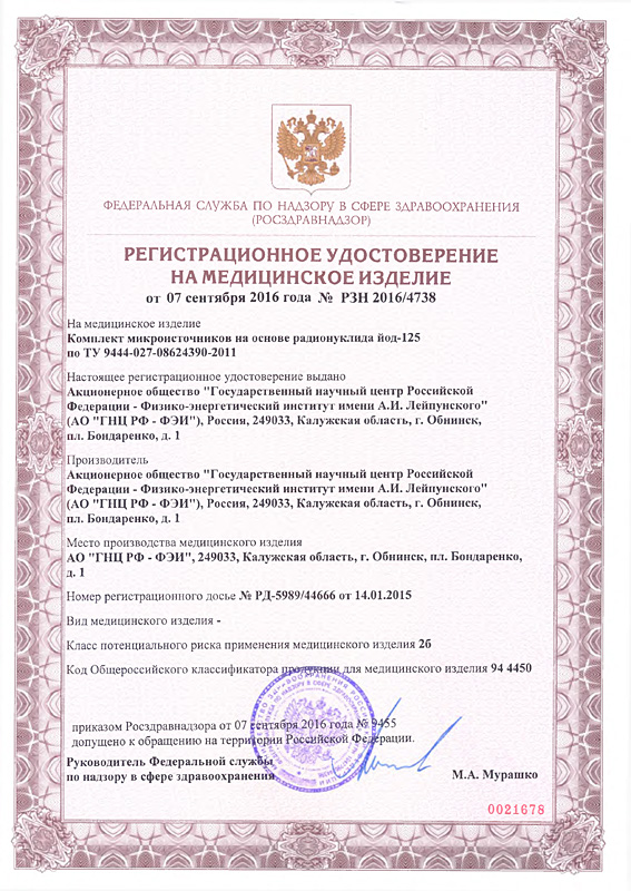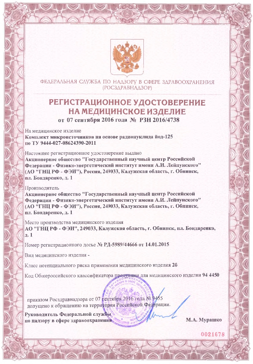 В 2016 году АО «ГНЦ РФ – ФЭИ» получило Регистрационное удостоверение на медицинское изделие «Комплект микроисточников на основе радионуклида йод-125 по ТУ 9444-027-08624390-2011» №РЗН 2016/4738 от 07.09.2016 г.