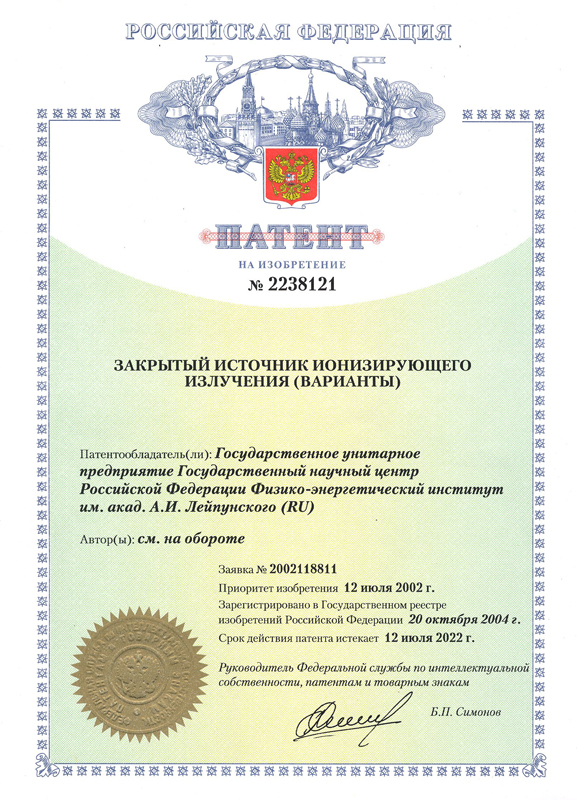 - Патент РФ на изобретение № 2238121. «Закрытый источник ионизирующего излучения (варианты)»