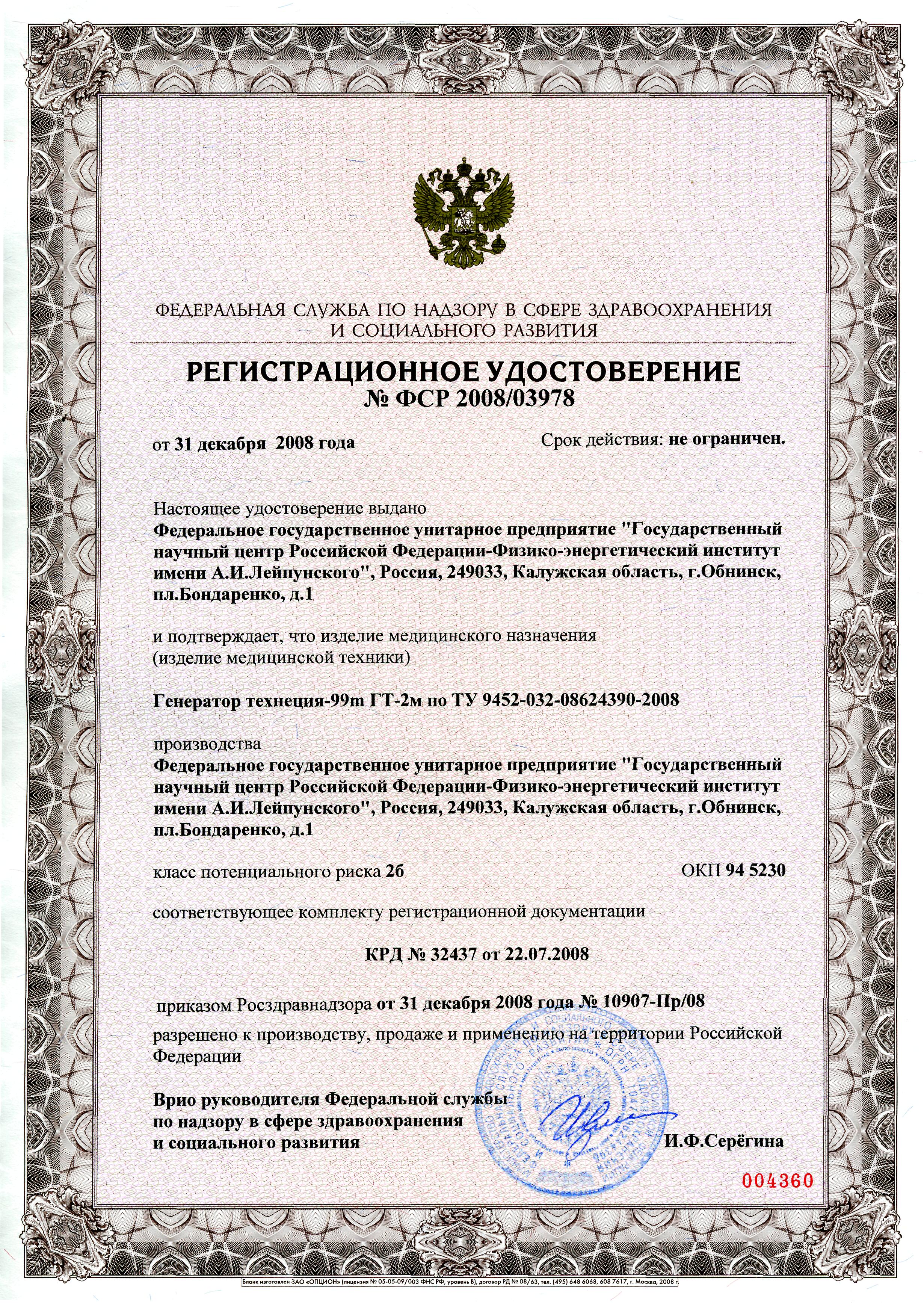 - Регистрационное удостоверение №ФСР 2008/03978 "Генератор технеция-99m ГТ-2м по ТУ 9452-032-08624390-2008" от 31.12.2008 г.
