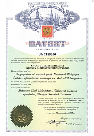 | 1 | 2189650 | 20.09.2002 | Способ обезвреживания жидких радиоактивных отходов | Мартынов П.Н., Богданович Н.Г., Григорьев Г.В. |