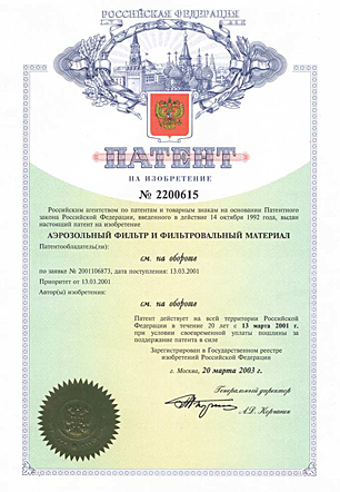 | 2 | 2200615 | 20.03.2003 | Аэрозольный фильтр и фильтровальный материал | Кузин В.В., Мартынов П.Н., Ягодкин И.В., Потоловский В.Г., Паповянц А.К., Болтоев Ю.Д., Мельников ;В.П., Двухименный В.А., Кадомцев Г.М., Егоров В.С. |