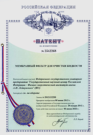 | 9 | 2542268 | 20.02.2015 | Мембранный фильтр для очистки жидкости | Мартынов П.Н., Ягодкин И.В. Григорьев Г.В., Григоров В.В., Мельников В.П., Дельнов В.Н. |