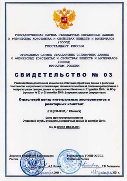 Центр является составной частью организационной структуры службы стандартных справочных данных о физических константах и свойствах веществ и материалов в области использования атомной энергии (ССДАЭ), аккредитуется в рамках ГК «Росатом».