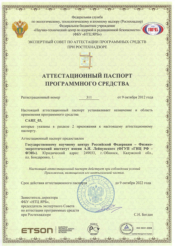 311 от 9.10.2012 CARE_03 ПС Аттестовано для расчета изотопного состава актинидов при выгорании и выдержки топлива и остаточного энерговыделения отработавшего ядерного топлива реакторов БН-600 и БН-800