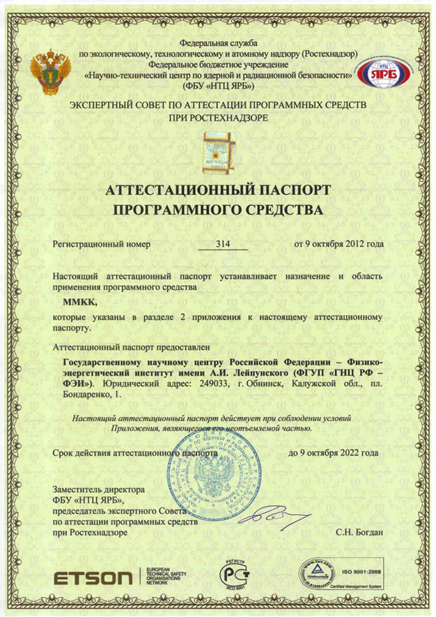 314 от 9.10.2012 ММКK Аттестовано для расчета коэффициентов размножения критических сборок различной конфигураций (типа БФС) с урановым, плутониевым и смешанным уран-плутониевым топливом (МОКС-топливо), коэффициентов размножения активной зоны реактора БН-800 с урановым или МОКС-топливом